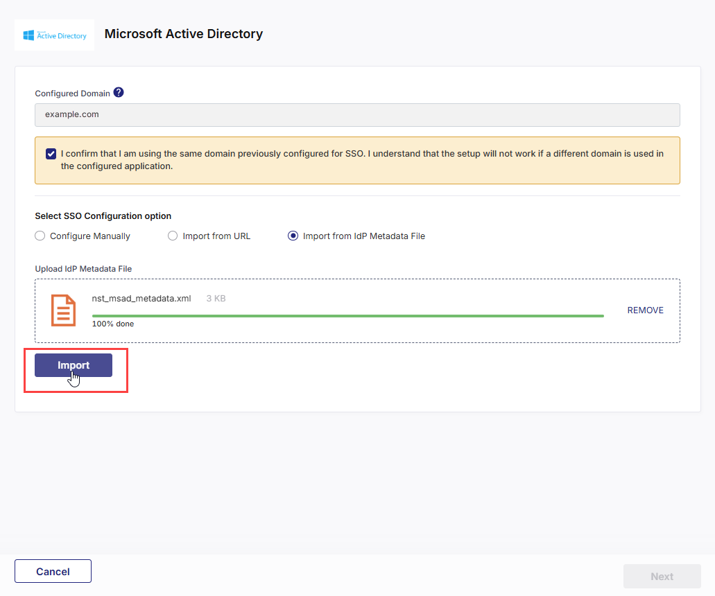 Click Import to retrieve the SSO configuration values. The following fields are auto-filled upon successful import: