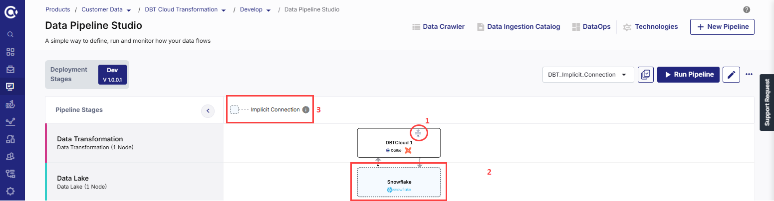 The dbt Cloud node in a data transformation pipeline is an explicit node. Unlike other data transformation nodes this node cannot be connected to any other data lake apart from its implicit data lake node.