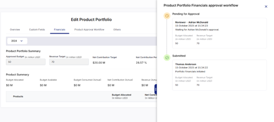 The Financials tab allows you to define and manage the budget and revenue targets for each product portfolio across one or more financial years. You can start by setting the financial details for the current year or select multiple years for long-term financial planning.