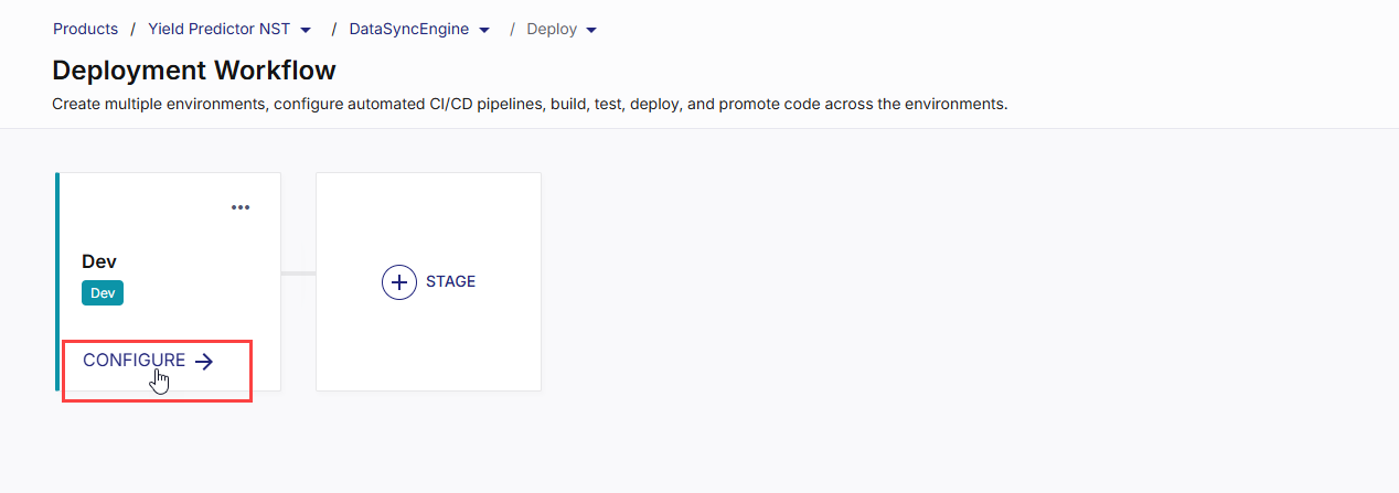 On the Deployment Workflow screen, in the stage tile that you want to configure, click CONFIGURE.
